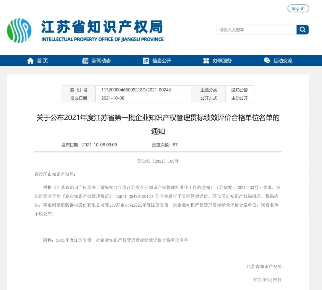 9月29日,江蘇省知識產權局發布了《關于公布 2021 年度江蘇省第一批企業知識產權管理貫標績效評價合格單位名單的通知》,南大環保“榜上有名”,表明公司知識產權管理體系已經符合國家標準《企業知識產權管理規范》(GB/T 2949...